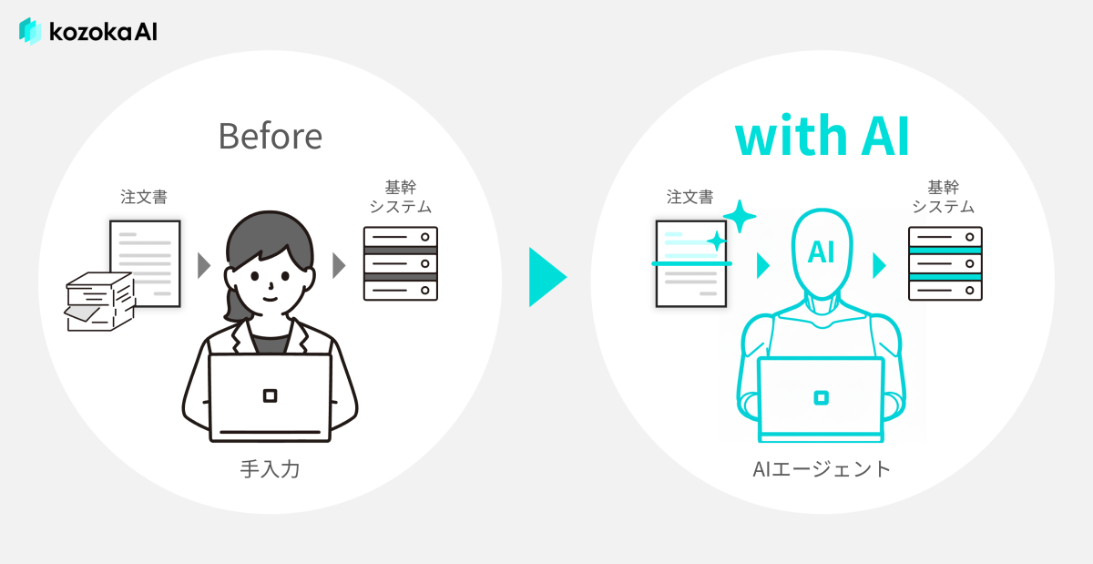 日本国内では依然としてFAXによる受発注が広く利用されており、非効率な手入力作業が業務負荷や人材不足の大きな課題となっています。kozokaAIは、FAXで受領した注文書をAIがOCR処理し、マスターデータとの照合を行い、自動で基幹システムに取り込む仕組みを提供します。